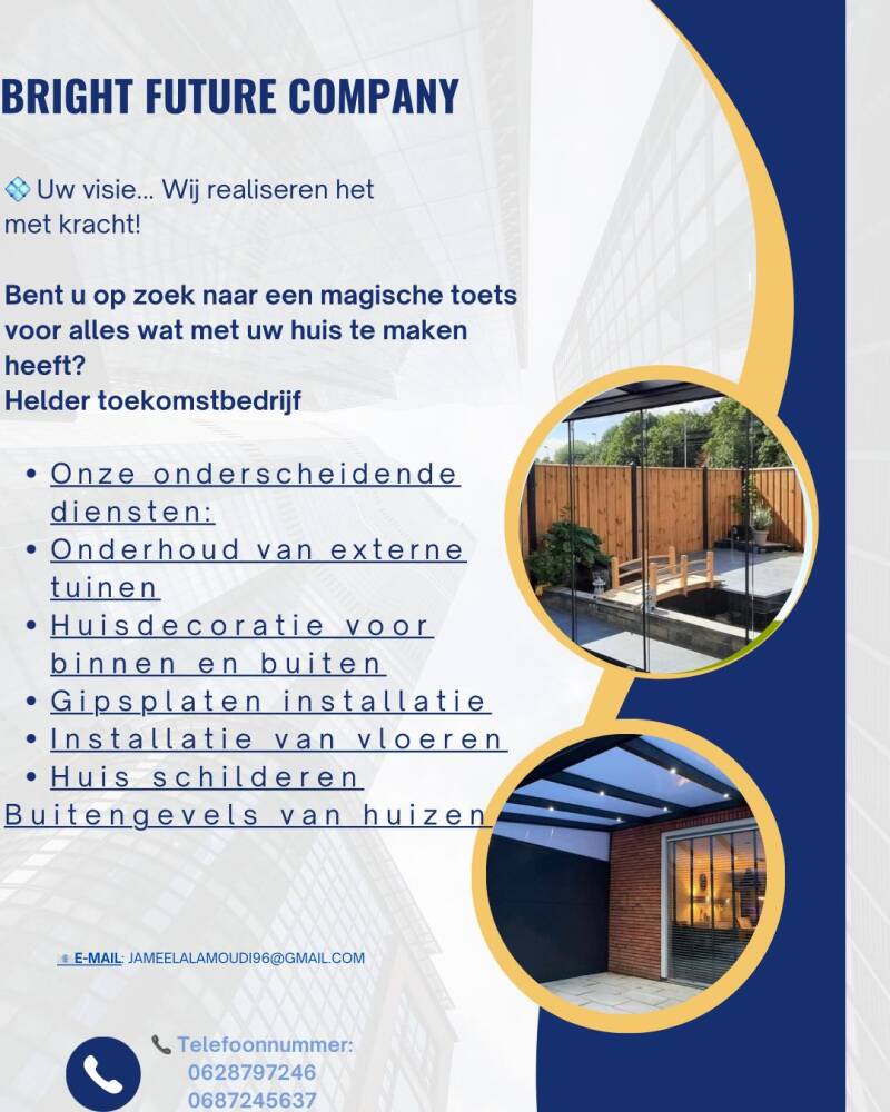 BRIGHT FUTURE COMPANY is een toonaangevend decoratiebedrijf in Amsterdam, Nederland. Met ons team van creatieve en professionele decorateurs streven we ernaar om unieke en stijlvolle decoraties te leveren die de verwachtingen overtreffen.